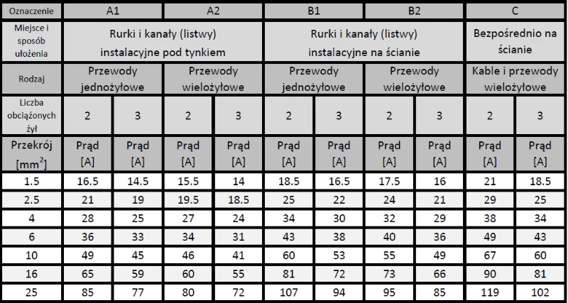 Przekrój? Jeśli odległość jest niewielka (do 10-15 m), możesz skorzystać z poniższej tabeli. Przewód będziesz układać w ziemi – brak takiej kolumny w tabeli. Przyjmij wtedy obciążalność dla przewodów pod tynkiem. Jeśli wiesz, jakiej mocy potrzebujesz – podziel tę wartość przez 230 V, wówczas otrzymasz wartość prądu.